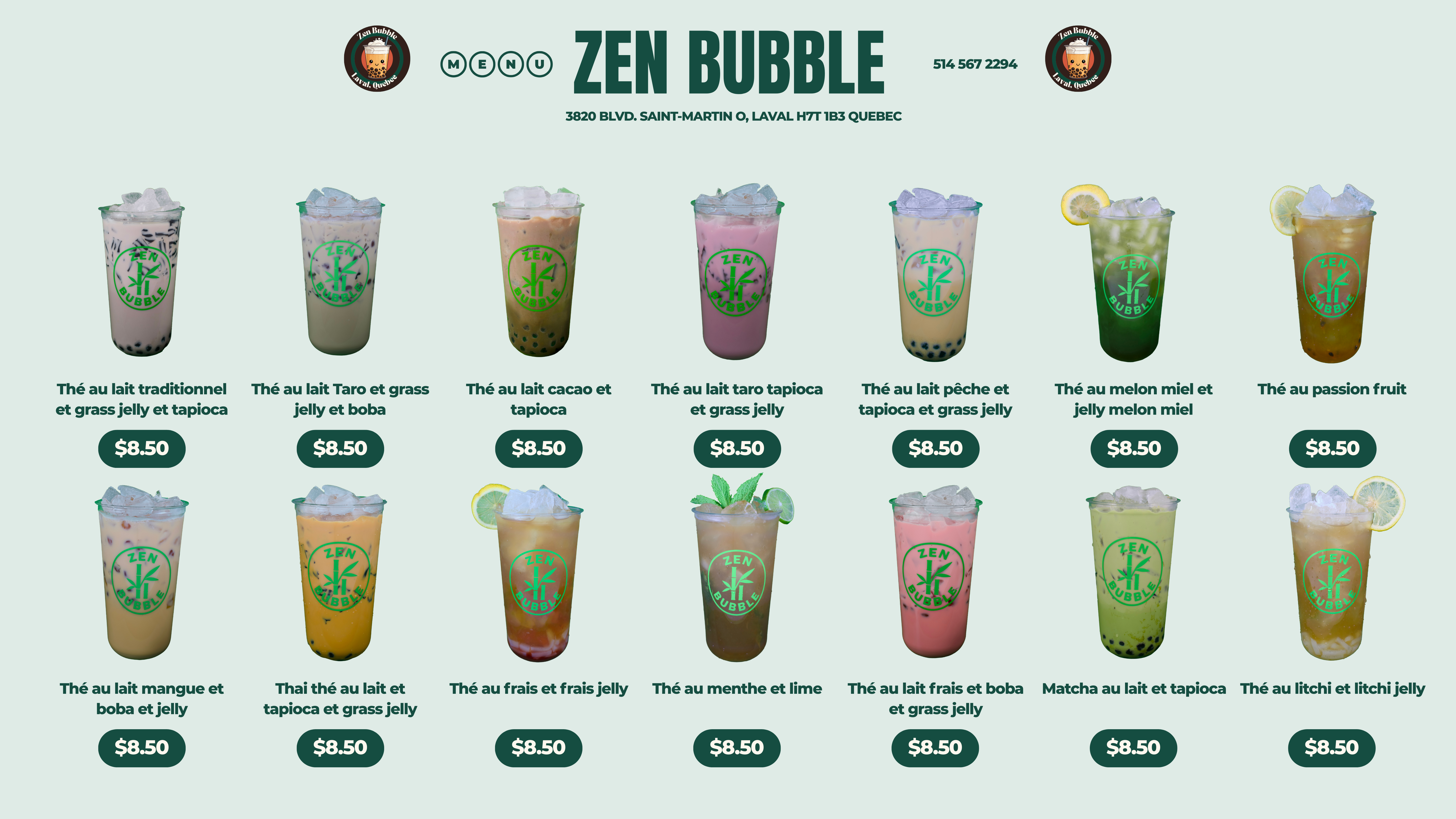 Au cœur d’un rythme de vie effréné, Zen Bubbletea est né comme une parenthèse de douceur pour les amoureux du thé au lait et des boissons rafraîchissantes. Inspirée par l’équilibre et la sérénité du “Zen”, chaque boisson chez Zen Bubbletea n’est pas seulement une boisson, mais une véritable expérience — où le thé délicat se marie harmonieusement aux fruits frais, au matcha pur et aux perles de tapioca soigneusement préparées. Nous croyons que, qu’il s’agisse d’un matin plein d’énergie ou d’une soirée dédiée à la détente, Zen Bubbletea vous accompagne toujours avec des saveurs subtiles, fraîches et riches en émotions.